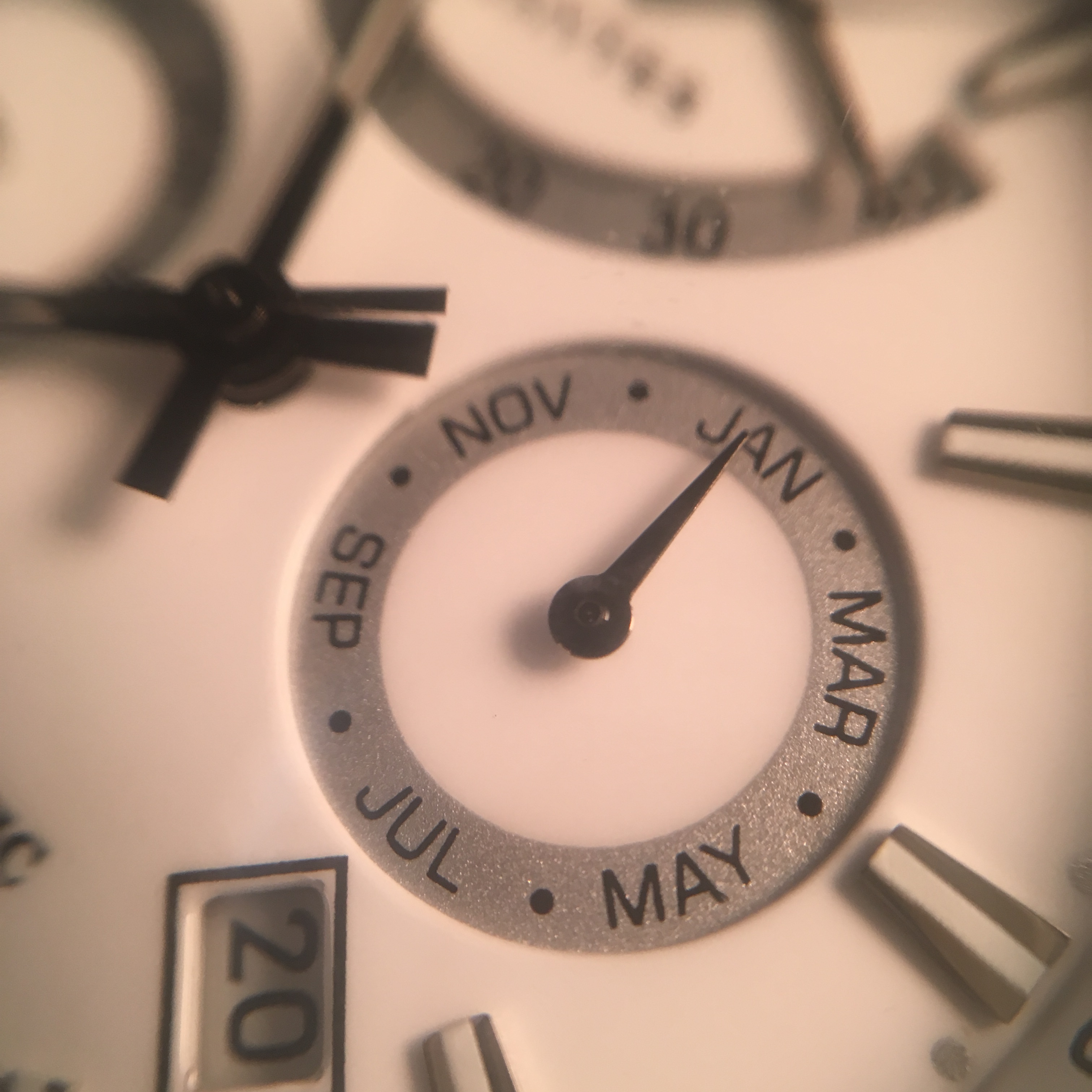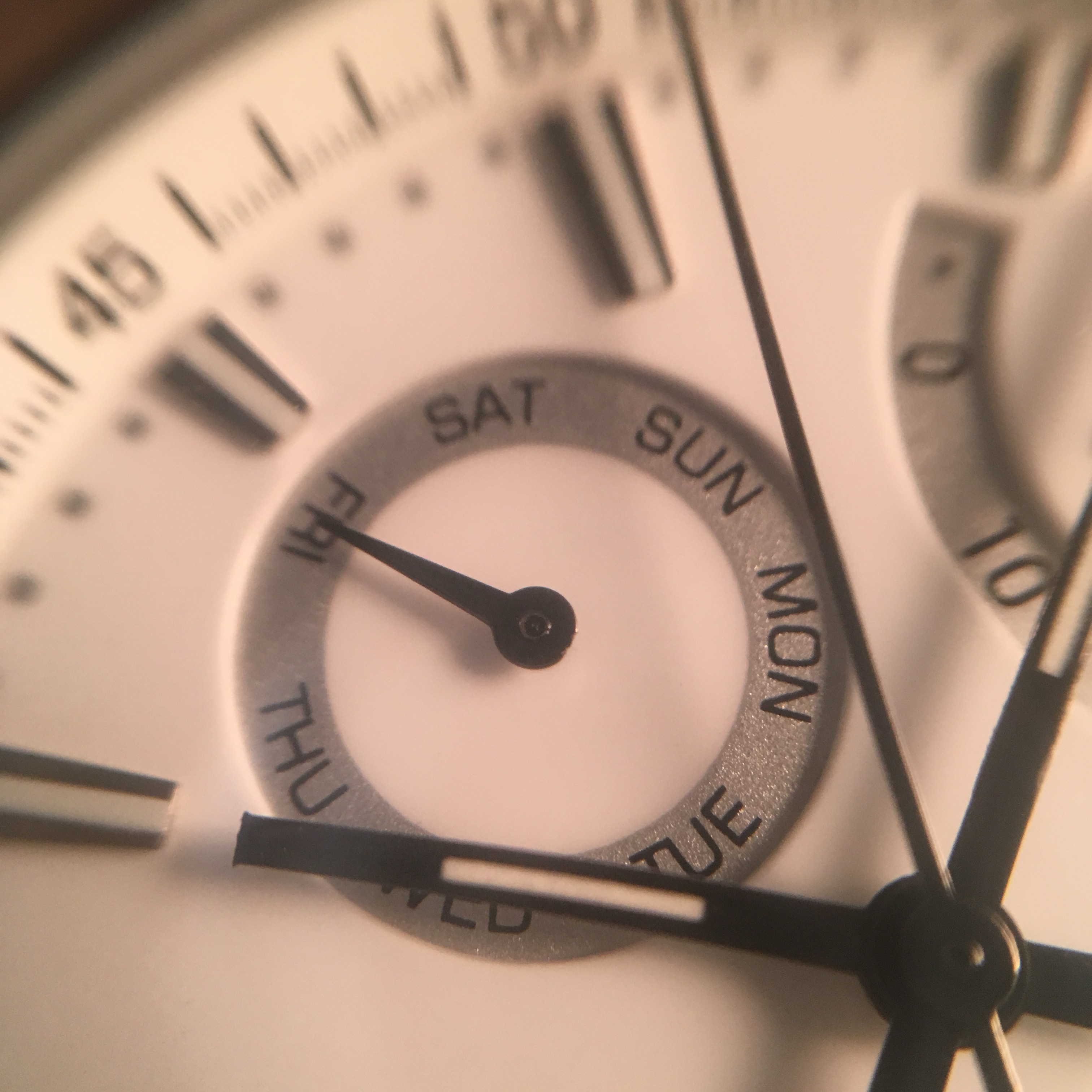 La prochaine sous-composition est située à la position 3 heures sur le cadran. Celui-ci est responsable de l'indication du mois. Inclus dans le kit est un long outil en forme d'aiguille qui, en soi, semble génial. Cet outil de recherche géniale sert à régler le mois en appuyant sur le bouton qui se trouve sur le côté de la couronne du boîtier à la position 2 heures. Il est en fait assez addictif d'utiliser l'outil pour configurer le mois. La numérotation secondaire située en face de l'indicateur de mois est le jour de la numérotation de la semaine. Cette caractéristique est basée sur la couronne lorsqu'elle est tirée dans la deuxième position. Cette sous-cadran est comme les autres en termes de textes imprimés noirs, toile de fond argentée avec une petite main noire. Toutes ces sous-cadrans sont très équilibrées et bien placées sur le cadran lui-même.